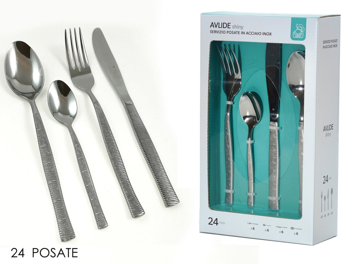 Servizio posate in acciaio inox 24 pezzi Linea Avlide, un servizio di posate ideale per imbandire una tavola dallo stile moderno! Materiale in acciaio inox