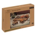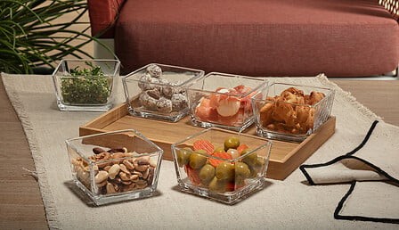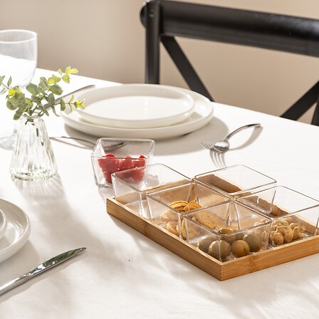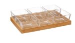 Include vassoi in bambù e ciotole in vetro trasparente