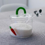 Zuccheriera in vetro borosilicato con cucchiaino e decori in vetro colorato. Ogni soggetto è realizzato artigianalmente in vetro soffiato rendendo ogni singolo articolo un pezzo unico.